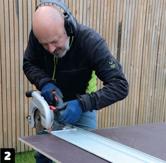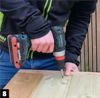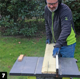 Halkaise viimeinen lauta. Muista ottaa huomioon pontin leveys. Tästä laudasta tulee 8 senttiä leveä. Se sahataan pöytä sirkkelillä, mutta voit käyttää myös pisto sahaa tai käsisirkkeliä.