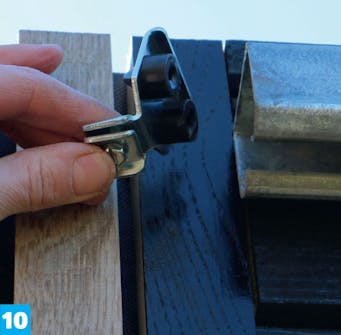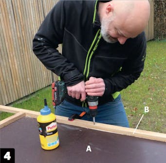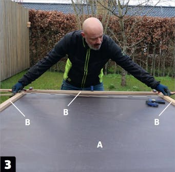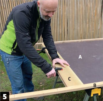 Aseta sivu- ja ylälistat (B) levyn (A) päälle ja kiinnitä ne puristimilla. Tässä käytetään 20x40 millin tammilistoja, mutta voit käyttää myös kestopuuta.