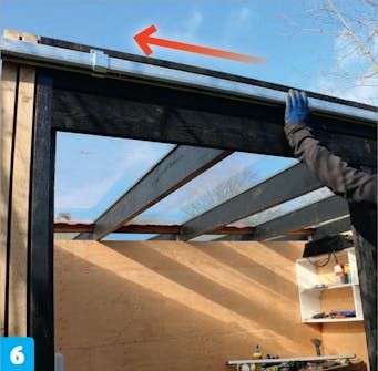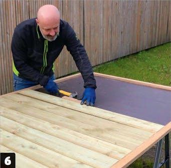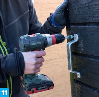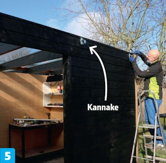 Aloita ulkovuorilautojen asentaminen. Sahaa pontti pois alimmasta laudasta. Kohdista laudat samalle tasolle vajan ulkovuorilautojen kanssa.