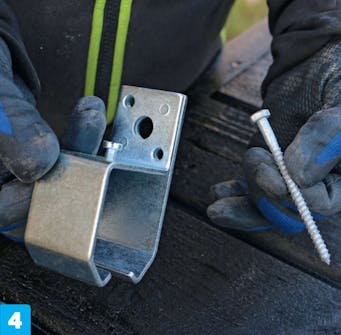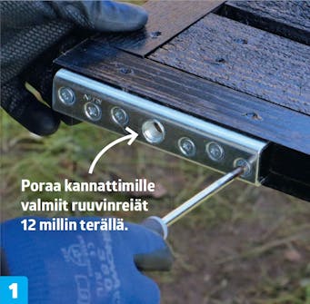 Poraa ruuveille valmiit reiät ja asenna sivulistat (B) ruostumattomilla 3,5x25 millin ruuveilla. Ylälistaan levitetään liimaa ennen ruuvaamista, sillä siitä tulee kantava osa.