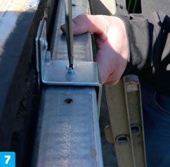 Kiinnitä kisko lopullisesti kiristämällä kannakkeiden yläruuvit. Nyt kisko on asennettu, ja voit nostaa oven paikalleen.