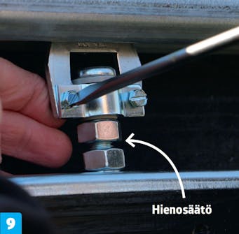 Kannake on säädettävä, mutta se liikkuu vain pari senttiä. Kannakkeen pituus pitää mitata suunnilleen oikein, jotta kiskon kan nakkeet osuvat oikealle korkeudelle.