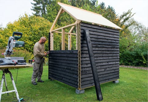 Asenna ensin yksi lauta jokaiselle sivulle noin 120 cm maantasosta ylöspäin. Voit asettaa ne vaakaan ja tarkasti yhtä korkealle koko liiterin ympäri ja merki-tä lopuksi kaikkiin kiinnitysruuvien paikat.