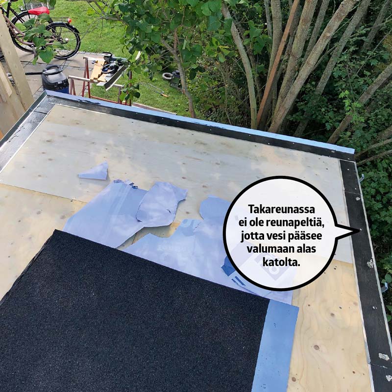 Aluskate on tehty 15 milliä paksuista katevanerilevyistä, jotka on kiinnitetty kattopalkkeihin. Katto on sopivan jyrkkä, kun etutolpat ovat 195 senttiä pitkät ja takatolpat 180 senttiä pitkät. Katon kolmelle reunalle asennetaan reunapellit ennen kattohuovan levittämistä. Siten liitoksista tulee tiiviit.