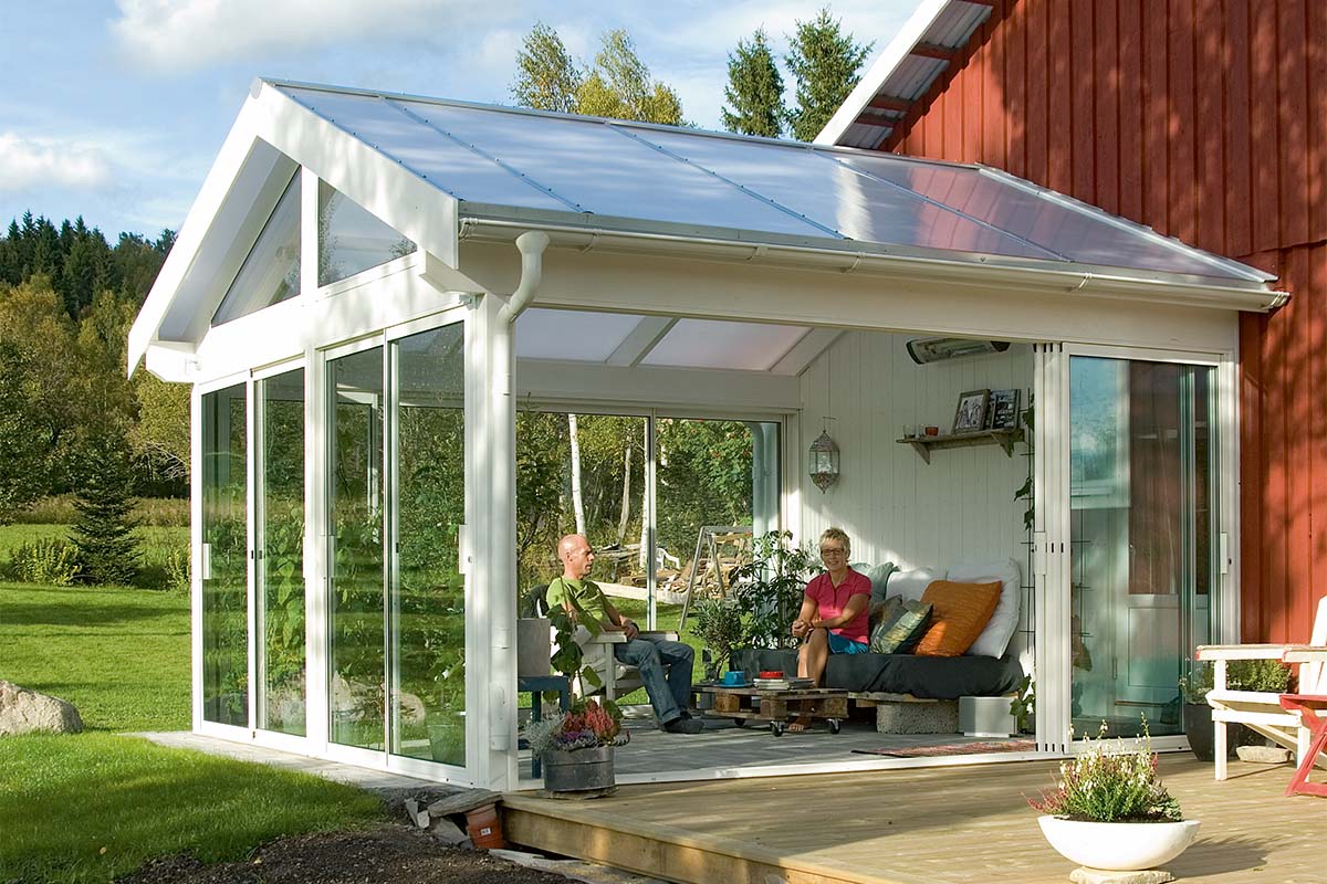 Terassin sivut suljetaan lasisilla liukuovilla, jotta lasiterassin seiniä voi avata ja sulkea täysin sään mukaan. Ovet liukuvat kiskoilla, ja julkisivussa kaikki neljä ovea liukuvat omissa urissaan niin, että kolme neljäsosaa seinäpinnasta voidaan työntää sivulle.