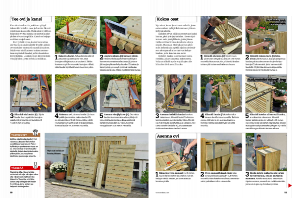 Kun työstät ovea, laudat kannattaa asettaa suorakulmaiselle levylle, jolloin ovesta tulee varmasti suorakulmainen. Sekä oven että kannen taakse asennetaan myös tukilaudat, joihin laudoitus kiinnitetään. Lisäksi oveen kiinnitetään vinojäykiste, jotta ovi ei ala roikkua.
