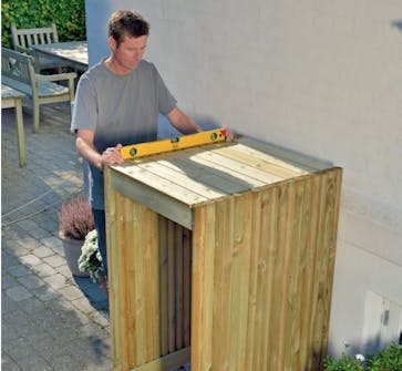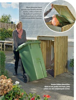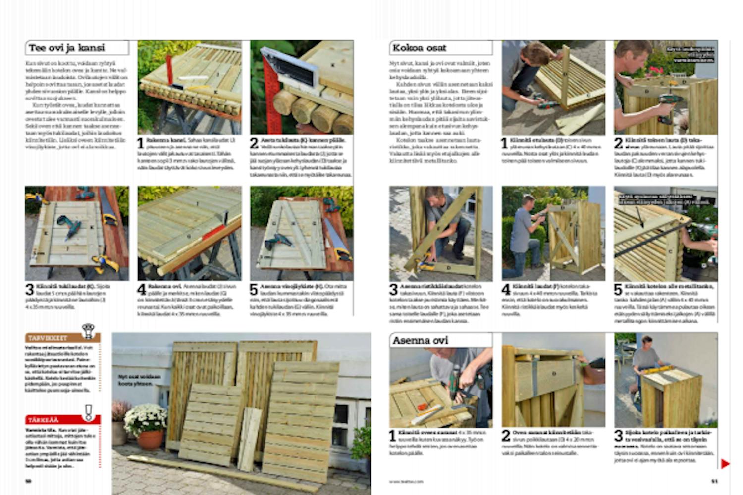 Kahden sivun väliin asennetaan kaksi lautaa, yksi ylös ja yksi alas. Eteen sijoi-tetaan vain yksi ylälauta, jotta jäteas-tialla on tilaa liikkua kotelosta ulos ja sisään. Huomaa, että takasivun ylim-män kehyslaudan pitää sijaita aavistuk-sen alempana kuin etusivun kehys-laudan, jotta kannen saa auki.