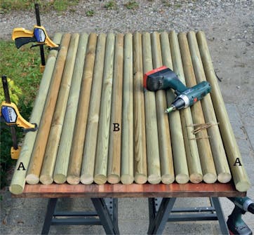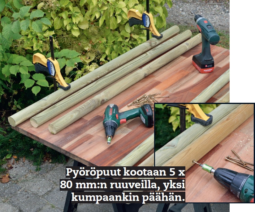 Lyhennä pyöröpuut sopivaan mittaan ja poraa reiät, yksi pyöröpuun kumpaan-kin päähän. Limitä reikiä noin 5 cm, jotta ruu-vit eivät osu toisiinsa. Reiät on helppo porata, jos sitoo pyöröpuut yhteen ilmastointiteipillä.