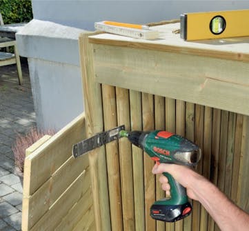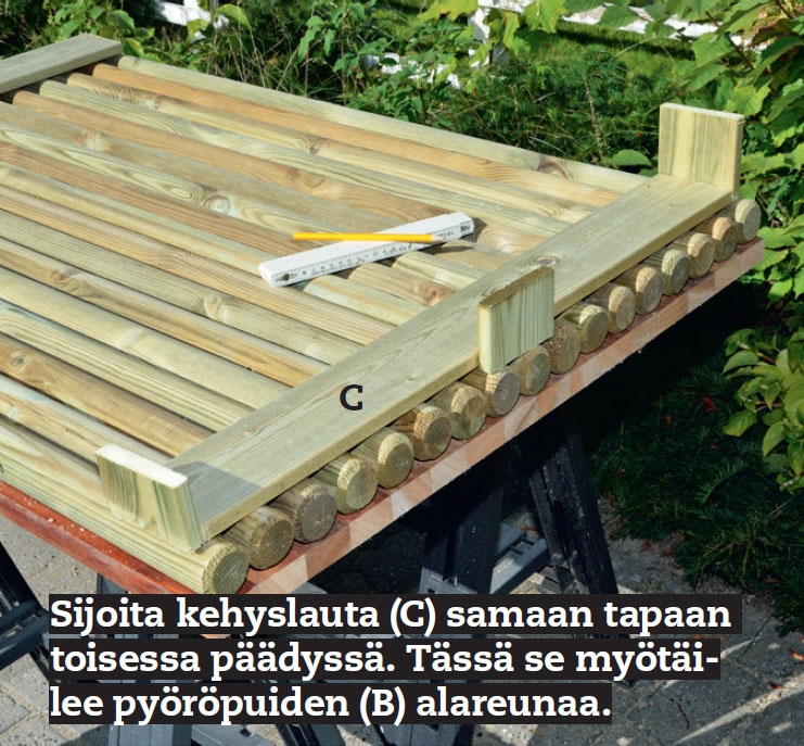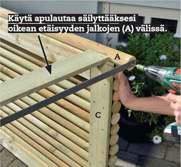 Asenna sivun yläosaan kehys-lauta (C). Sijoita se noin laudan leveyden verran sivun yläreunasta ja yhtä etäälle molemmista sivuista. Voit käyttää paria laudanpätkää mittana. Kiinnitä lauta parilla 4 x 40 mm:n ruuvilla.