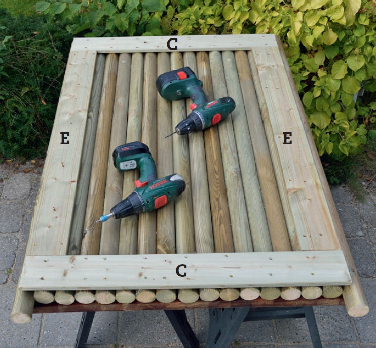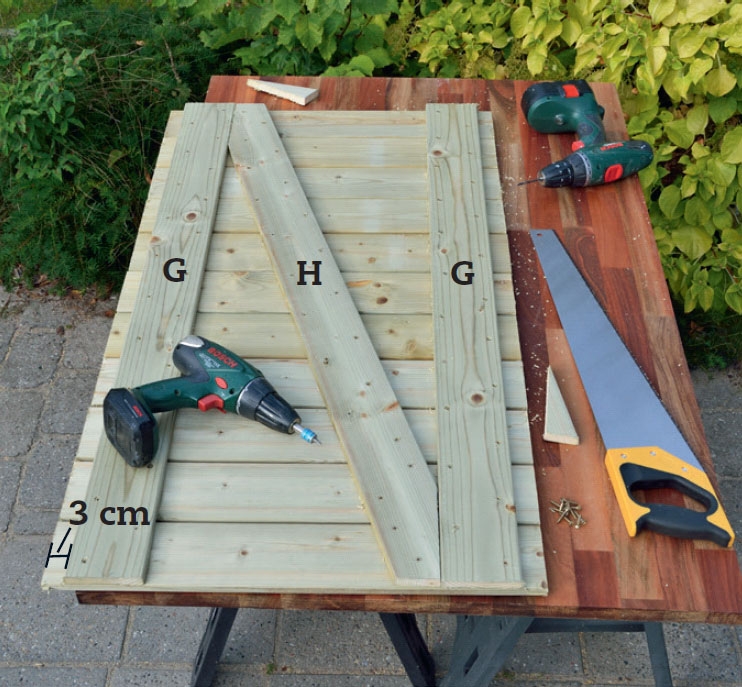 Rakenna ovi. Asenna laudat (J) sivun päälle ja merkitse, miten laudat (G) on kiinnitettävä (tässä 3 cm:n etäisyydelle reunasta). Kun kaikki osat ovat paikoillaan, kiinnitä laudat 4 x 35 mm:n ruuveilla.