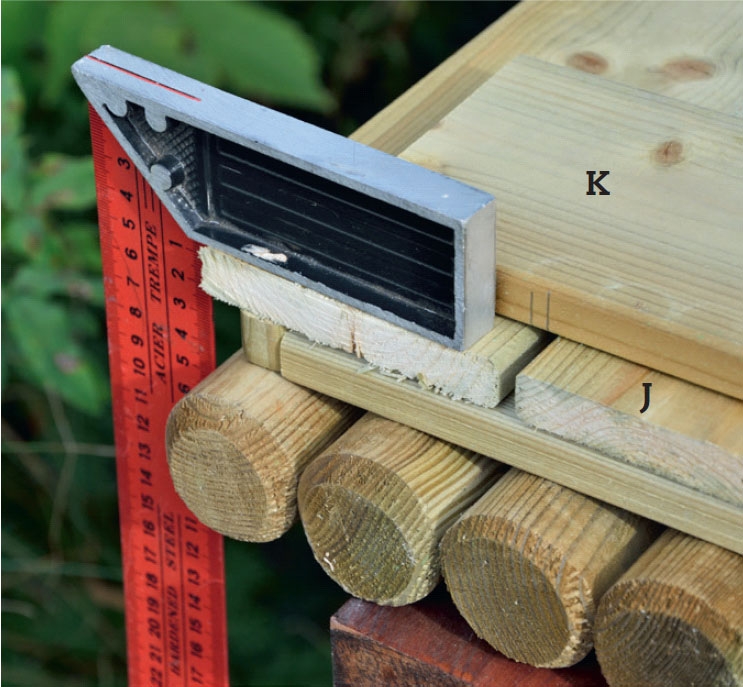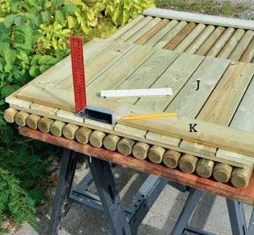 Rakenna kansi. Sahaa kansilaudat (J) pituuteen ja asenna ne niin, että lautojen välit jakautuvat tasaisesti. Tähän kanteen sopii 3 mm:n rako lautojen välissä, näin laudat täyttävät koko sivun leveyden.