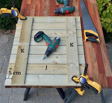 Kiinnitä tukilaudat (K). Sijoita laudat 5 cm:n päähän lautojen päädyistä ja kiinnitä ne lautoihin (J) 4 x 35 mm:n ruuveilla.