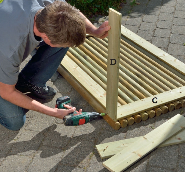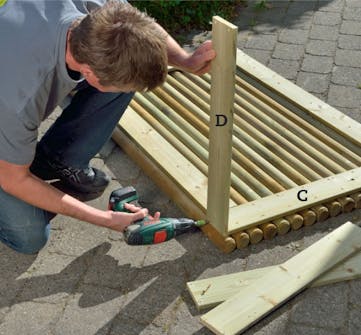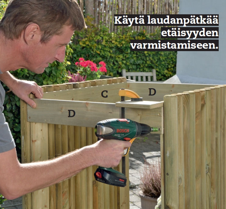 Kiinnitä etulauta (D) toisen sivun yläreunan kehyslautaan (C) 4 x 40 mm:n ruuveilla. Nosta osat ylös ja kiinnitä laudan toinen pää toiseen valmiiseen sivuun.
