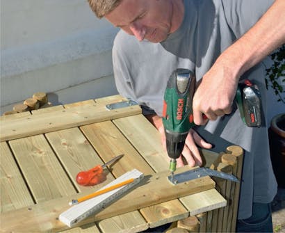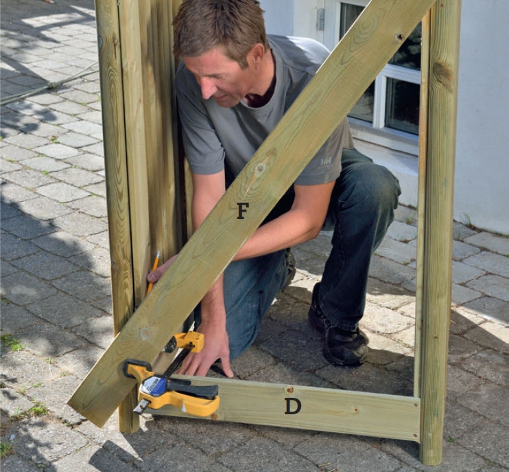Asenna vinojäykiste (H). Ota mitta laudan kummastakin viistopäädystä niin, että lauta sijoittuu diagonaalisesti kahden tukilaudan (G) väliin. Kiinnitä vinojäykiste 4 x 35 mm:n ruuveilla.