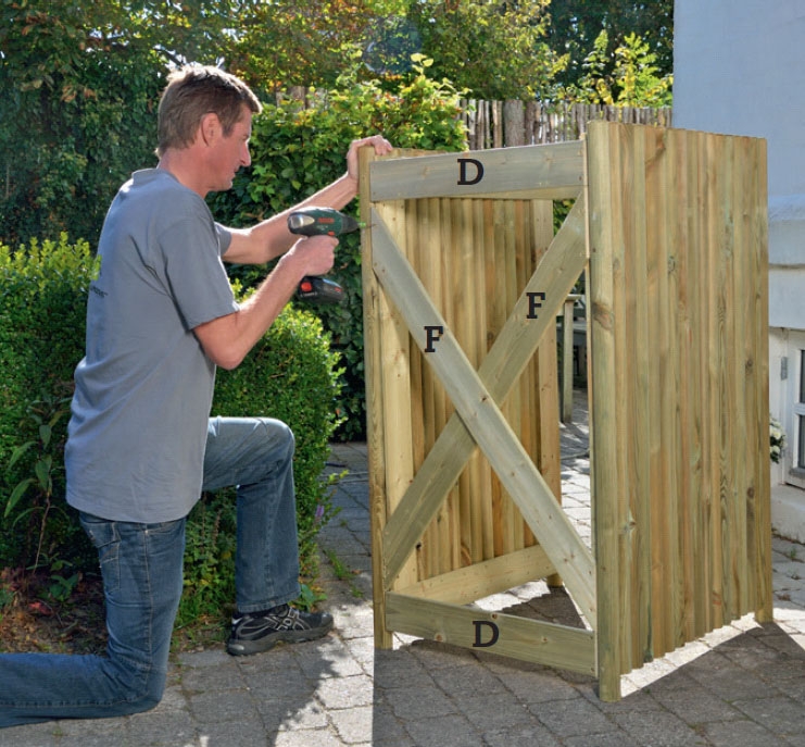 Kiinnitä laudat (F) kotelon taka-sivuun 4 x 40 mm:n ruuveilla. Tarkista ensin, että kotelo on suorakulmai nen. Kiinnitä ristikkäislaudat myös keskeltä ruuvilla.