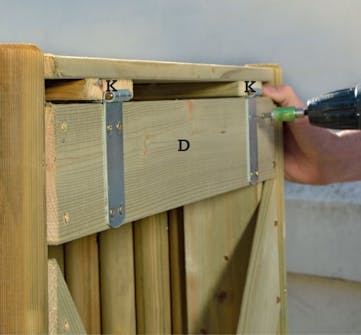 Kiinnitä toinen lauta (D) taka-sivun yläreunaan. Lauta pitää sijoittaa laudan paksuuden verran sivujen kehys-lautoja (C) alemmaksi, jotta kannen tukilaudoille (K) jää tilaa kannen alapuolella. Kiinnitä lauta (D) myös alareunaan.