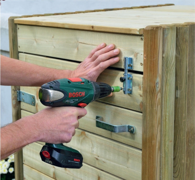 Jäljellä on enää viimeistelytöitä. Ovi asennetaan kahden saranan varaan, jotka sijoitetaan toisen sivun sisäpin-taan. Oven etupintaan asennetaan kahva, jotta ovi on helppo avata ja sulkea, kun jäteastia tullaan tyhjentämään. Lisäksi oven yläosaan asennetaan salpa, joka estää ovea kolisemasta.