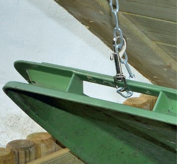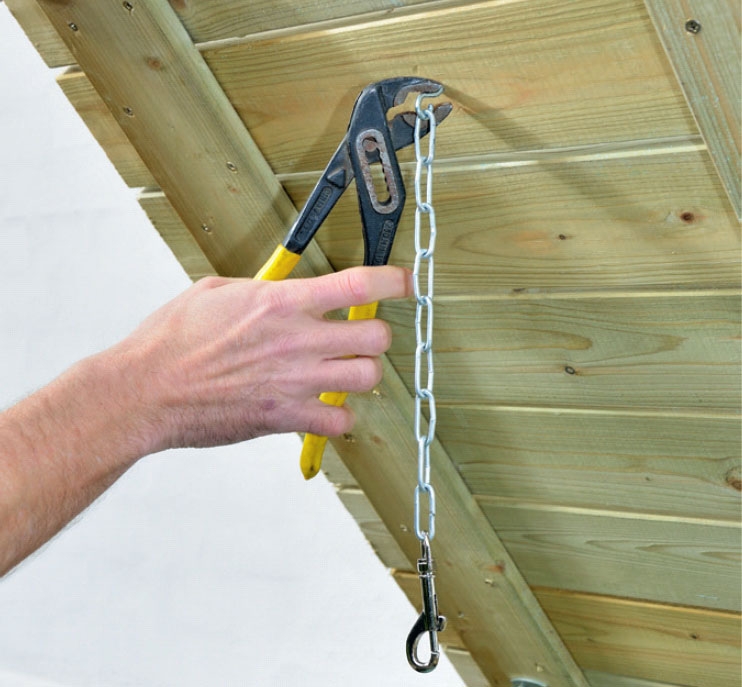 Kiinnitä kannen alapintaan sil-muk ka ja silmukkaan ketju. Kun ketju on paikallaan, purista silmukka yhteen pihdeillä, jotta ketju ei pääse putoa maan. Ketjun toiseen päähän kiinnitetään karabiinihaka, joka yhdistetään jäteastian kanteen.