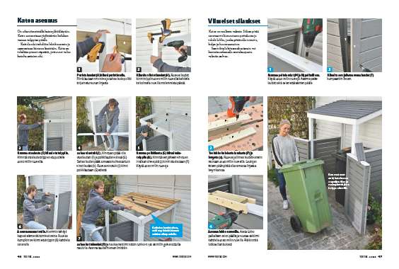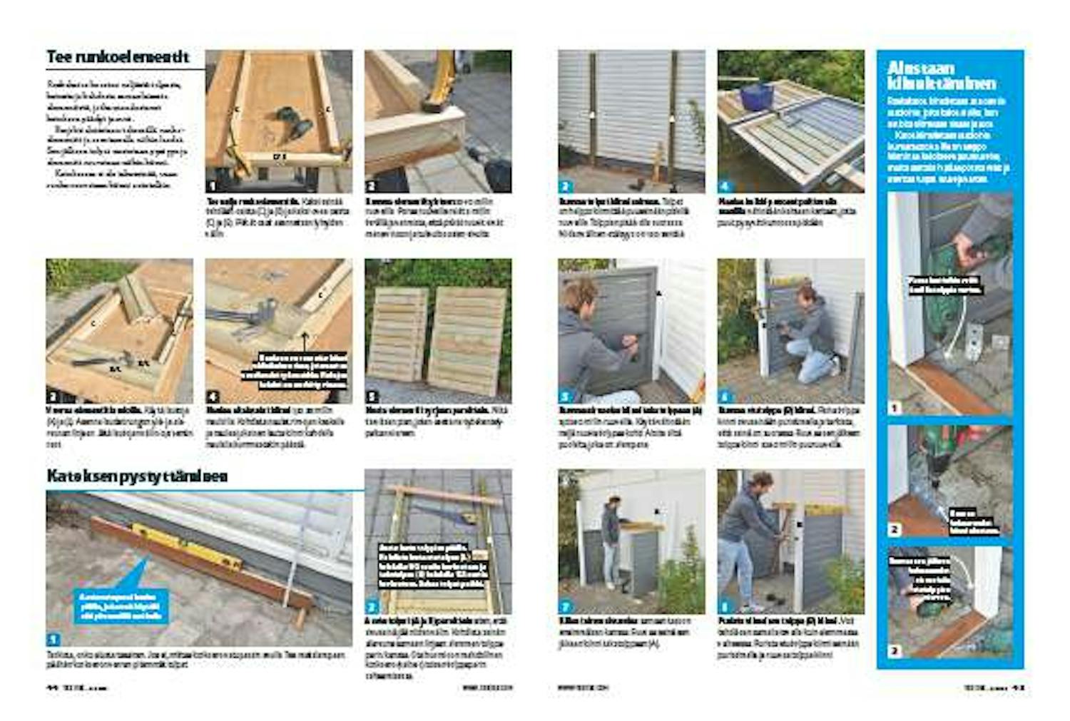 Projekti aloitetaan tekemällä runkoelementit ja asentamalla niihin laudat. Sen jälkeen tolpat nostetaan pystyyn ja elementit ruuvataan niihin kiinni.