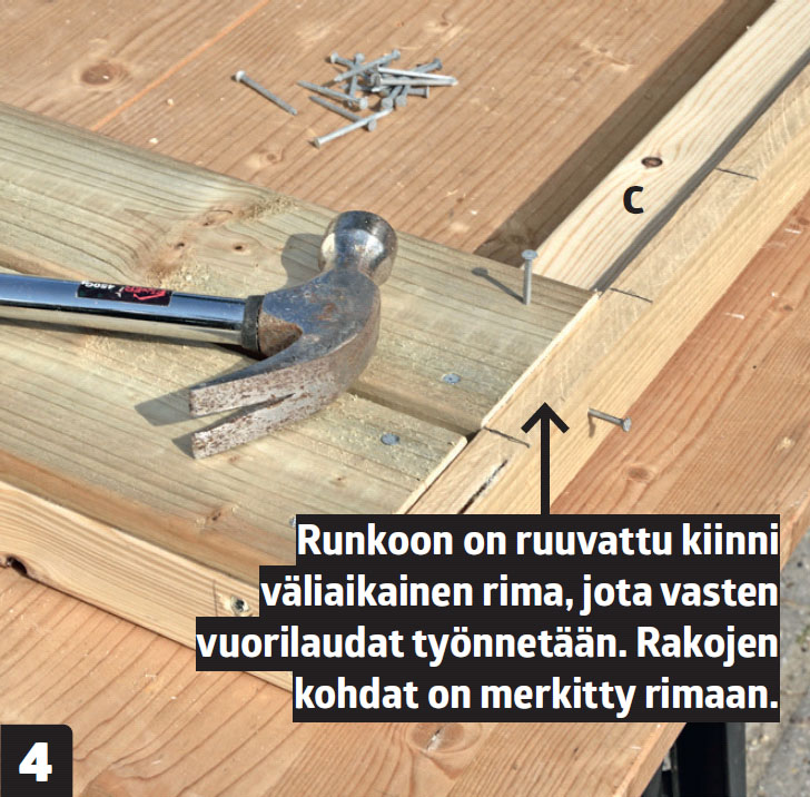 Naulaa aitalaudat kiinni 1,8x35 millin nauloilla. Kohdista naulat rimojen keskelle ja naulaa jokainen lauta kiinni kahdella naulalla kummastakin päästä.