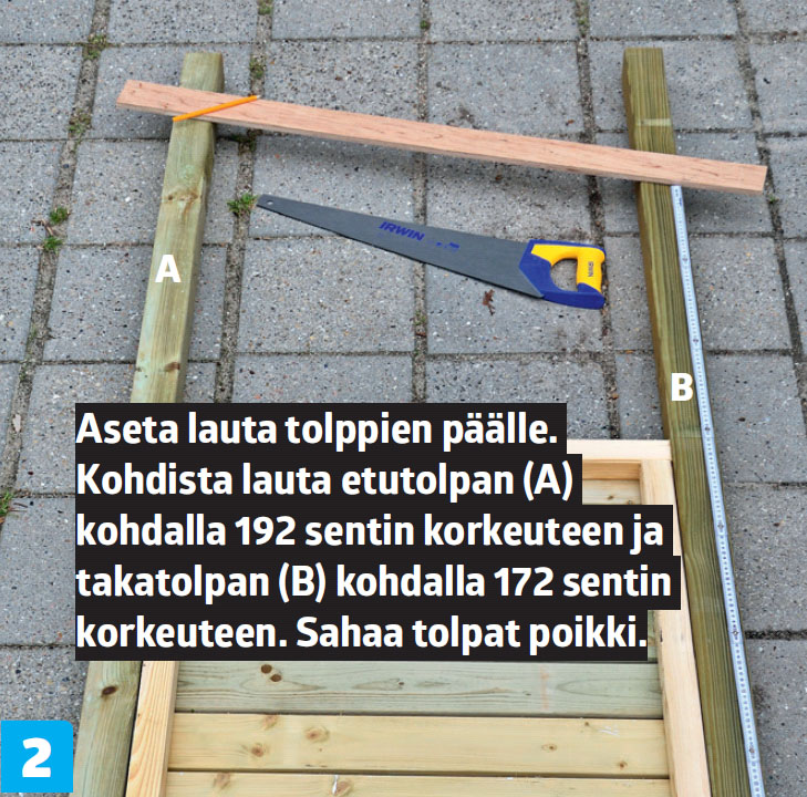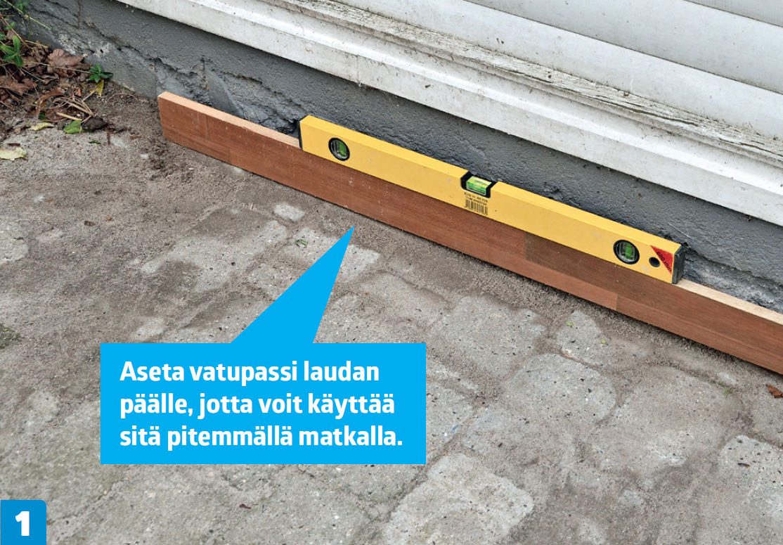 Tarkista, onko alusta tasainen. Jos ei, mittaa korkoero vatupassin avulla. Tee matalampaan päähän korkoeron verran pitemmät tolpat.