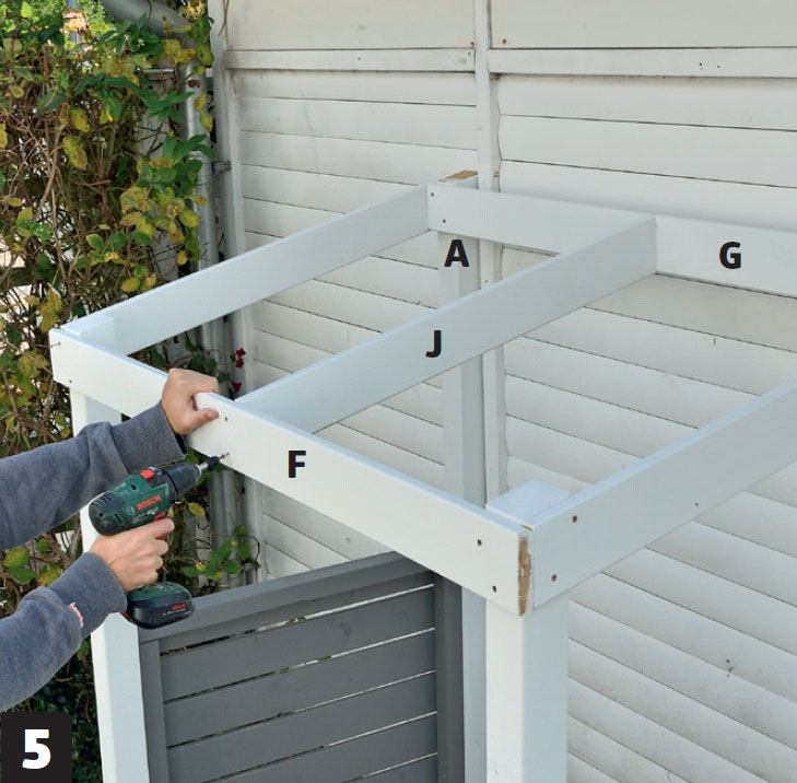 Ruuvaa poikkilauta (G) kiinni taka -tolppiin (A). Kiinnitä sen jälkeen vinotuen irrallaan oleva pää (J) kiinni otsalautaan (F). Käytä 4x50 millin ruuveja.