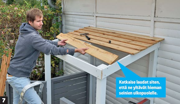 Kattolaudat tehdään lehtikuusesta ja asennetaan hieman limittäin. Kattoon tehdään pienet räystäät, jotta vesi valuu katolta seinien ohi.