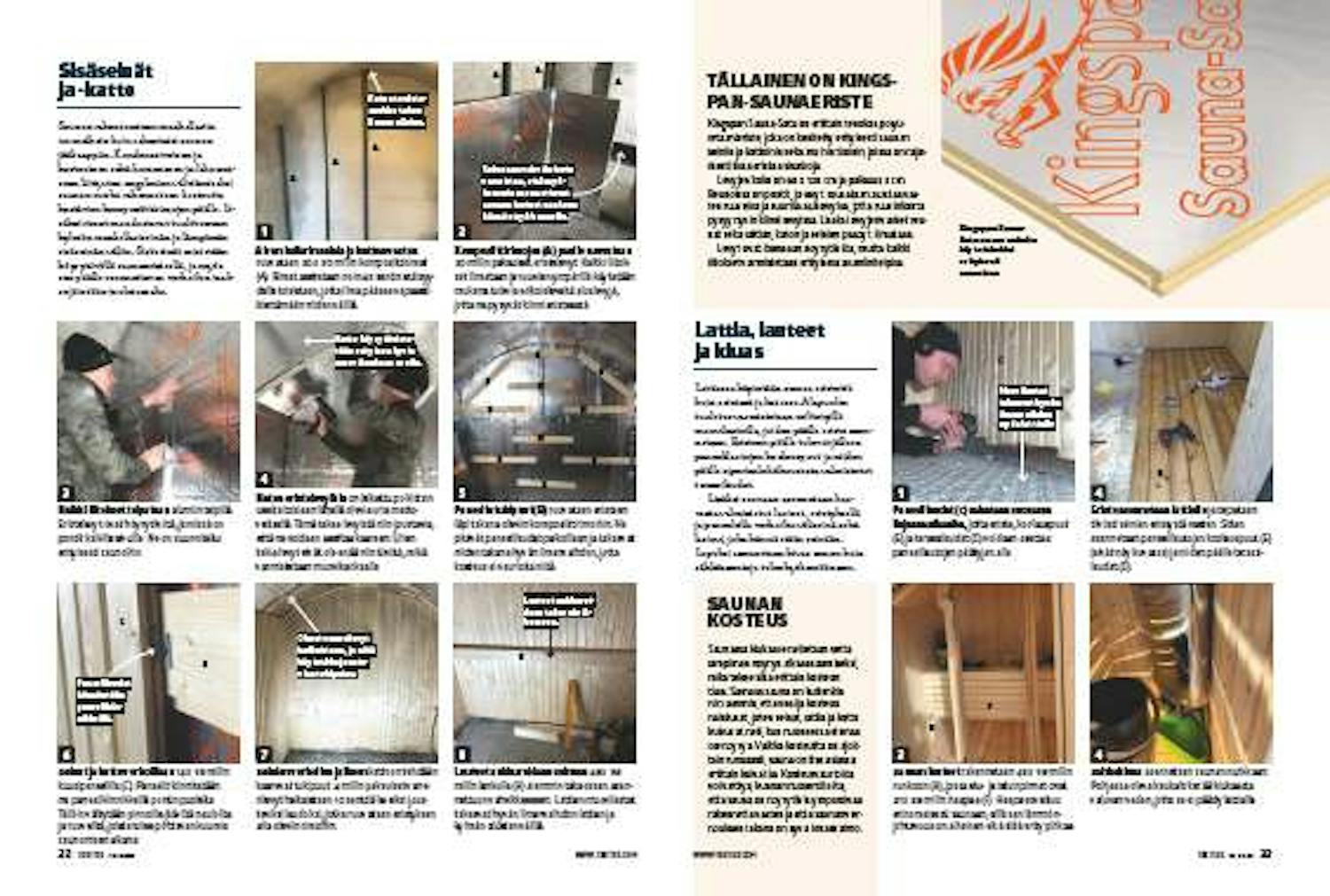 Lisäksi saunaan asennetaan haavasta valmistetut lauteet, eristyksellä ja paneeleilla verhoiltu väliseinä sekä lasiovi, joka kiinnitetään seinään. Lopuksi asennetaan kiuas ennen kuin sähköasentaja tulee kytkemään sen.