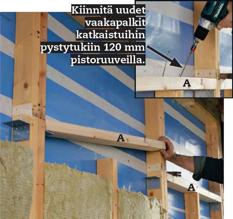 Kiinnitä rungon uudet vaakapalkit (A) täyspitkiin pystytolppiin vankoilla kulmalevyilä. Käytä naulauslevyissä oikeita levyruuveja, kuten aina, äläkä sijoita ruuveja liian tiiviisti tai liian lähelle reunaa, jotteivät ne halkaise puuta.