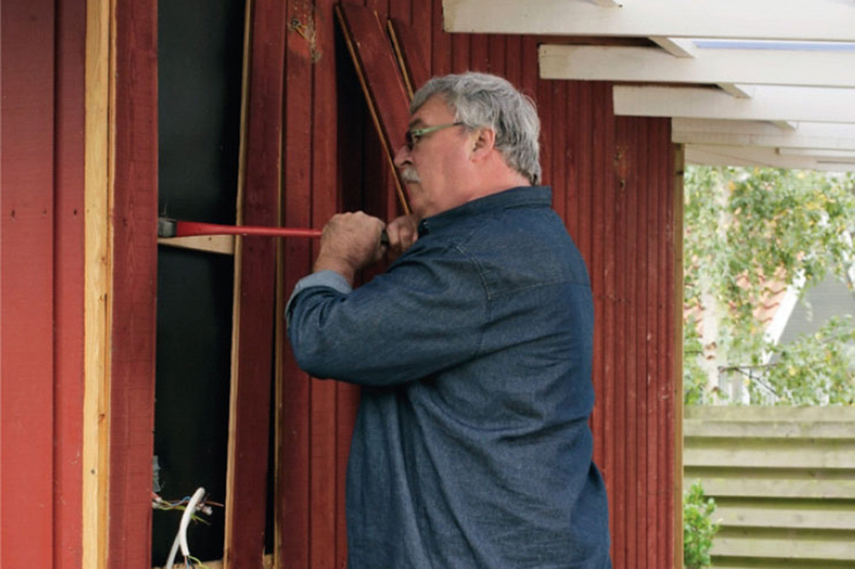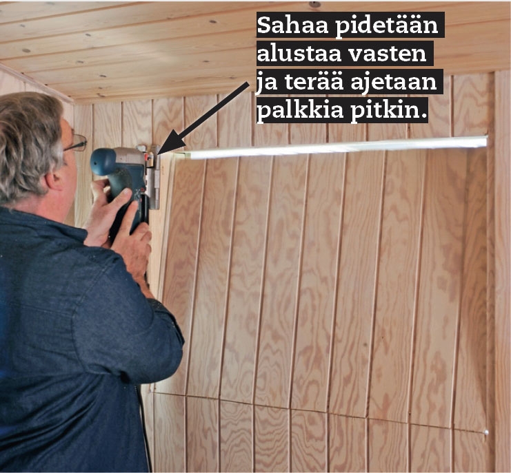 Sahaa käsisahalla rakenteeseen tilaa uusille ikkunoille. Varo sähkökaapeleita ja ole varovainen, ettet tee höyrysulkuun reikää. Jos näin kuitenkin kävisi, paikkaa reikä höyrysulkuteipillä.