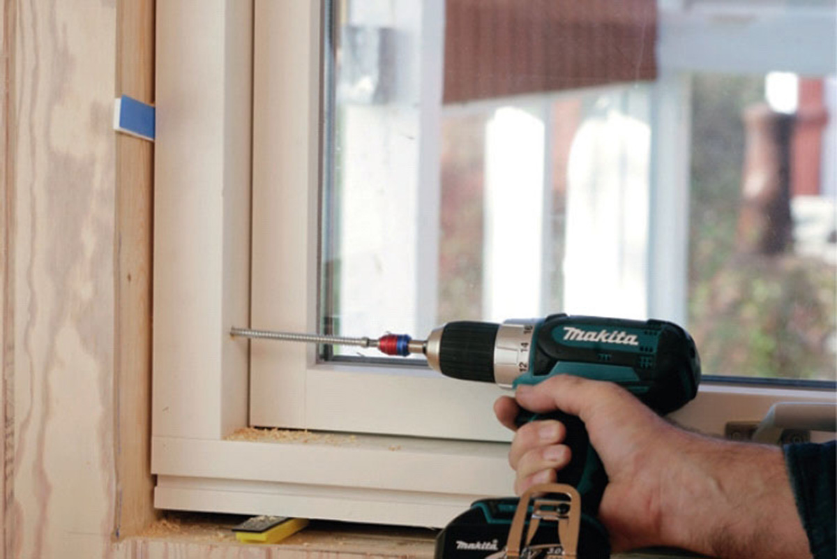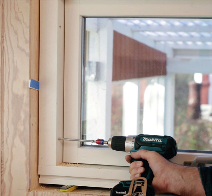 Aukko sahataan sisäpuolelta. Jotta näkisimme sahauskohdan, poraamme ikkuna-aukon sisäverhoilun kulmiin ulkoa päin reiät 10 mm poralla.