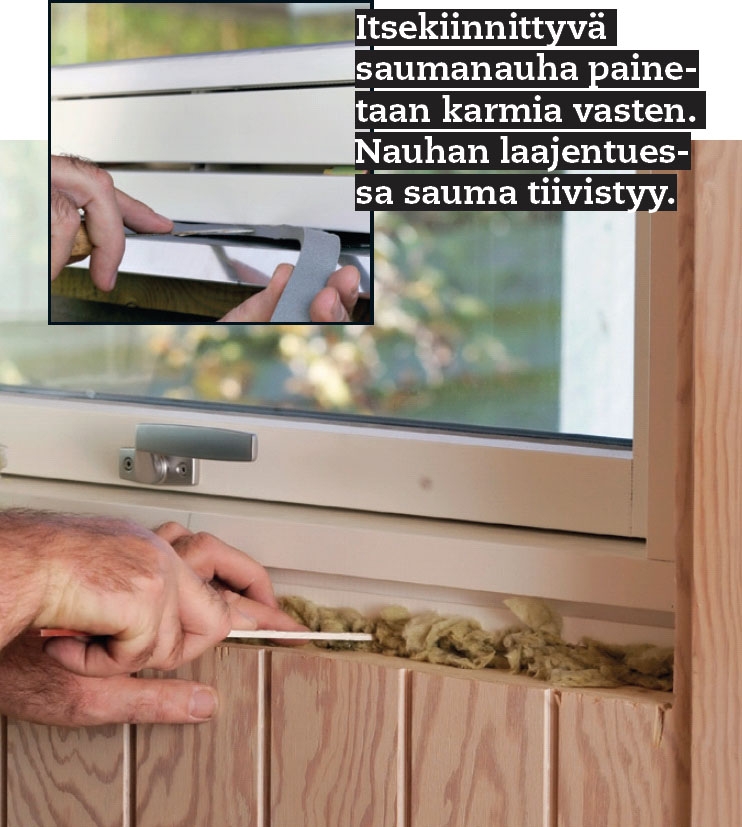 Tiivistä saumat ulko- ja sisäpuolelta. Kun kiilat on poistettu, työnnä saumoihin mineraalivillaa. Tiivistä sisäsaumat akryylisaumamassalla ja pursota sitä pyöreän pohjanauhan päälle. Käytä ulkosaumoissa laajentuvaa saumanauhaa.