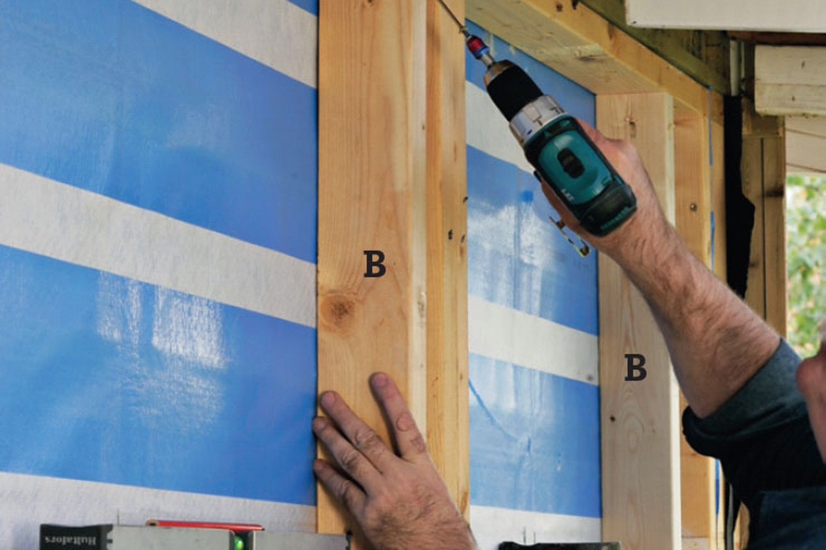Kiinnitä tuulensuojapaperin päälle tuuletusrimat (D) vaakarimojen (C) päälle. Ne takaavat verhoilulautojen tuuletuksen. Siksi ne asennetaan lyhyinä pätkinä, joiden väliin jää hieman rakoa.