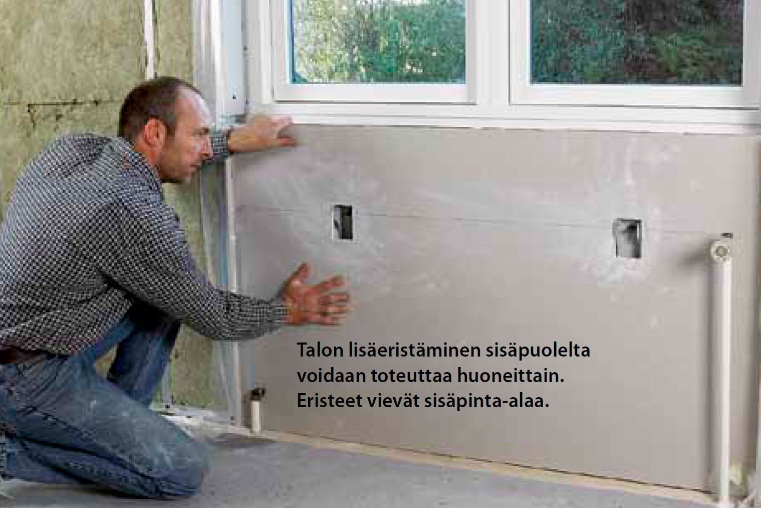 Kylmän ulkoseinän eristäminen sisäpuolelta on usein nopein ja helpoin ratkaisu, jolla voi säästää energiaa. Työssä ei menetä muuta kuin hieman millimetrejä talon sisämitoista.