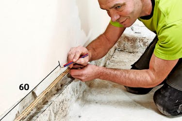 Merkitse lankkujen paikat seinään. Asenna ensimmäinen lankku viiden sentin päähän seinästä ja loput 60 sentin päähän toisistaan. Se on lattian runkolankkujen maksimiväli.