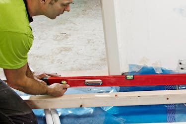 Tarkista, että jokainen lankku on vaakatasossa asettamalla vatupassi pituussuuntaan lankkujen päälle. Tarkista aluksi, että seinän vieressä oleva lankku on oikealla korkeudella. Käytä tukemiseen mieluummin puoli tuntia liikaa kuin liian vähän aikaa, jotta saat lankut suoraan.