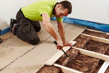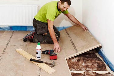 Lankkujen väliin asennetaan aluksi eristeet, minkä jälkeen lankkuihin kiinnitetään lastulevyt. Limitä lastulevyjen saumoja vähintään 30 senttiä, jotta lattiasta tulee tarpeeksi kestävä. Tähän lattiaan käytetään 180-senttisiä levyjä, sillä niitä on helpompi käsitellä kuin 240-senttisiä levyjä.