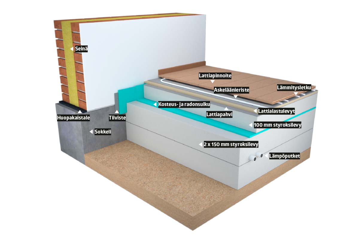 300 millin kerros styroksia pitää lattian lämpimänä. Tähän lattiaan lisättiin vielä ylimääräinen kymmenen sentin kerros styroksia, jotta lämpöputket saatiin asennettua sen sisään kosteussulun päälle. Ylimääräisen styroksikerroksen ansiosta putket voi tarvittaessa korjata helposti. Rakenne oli helpointa toteuttaa 150+150+100 millin styroksilevyillä.