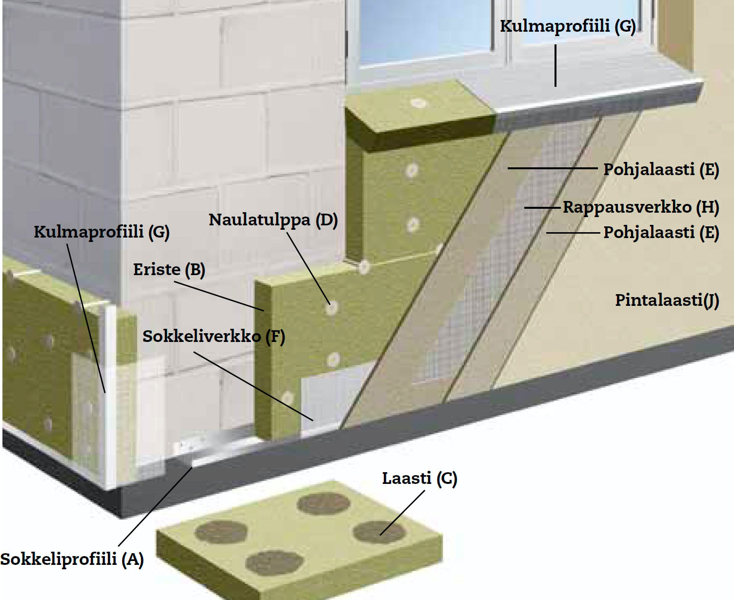 Laasti (E) levitetään eristeen päälle. Pehmeän laastin päälle tulee verkko (H), sen päälle jälleen hieman laastia ja lopuksi koko seinäpinta silotetaan.