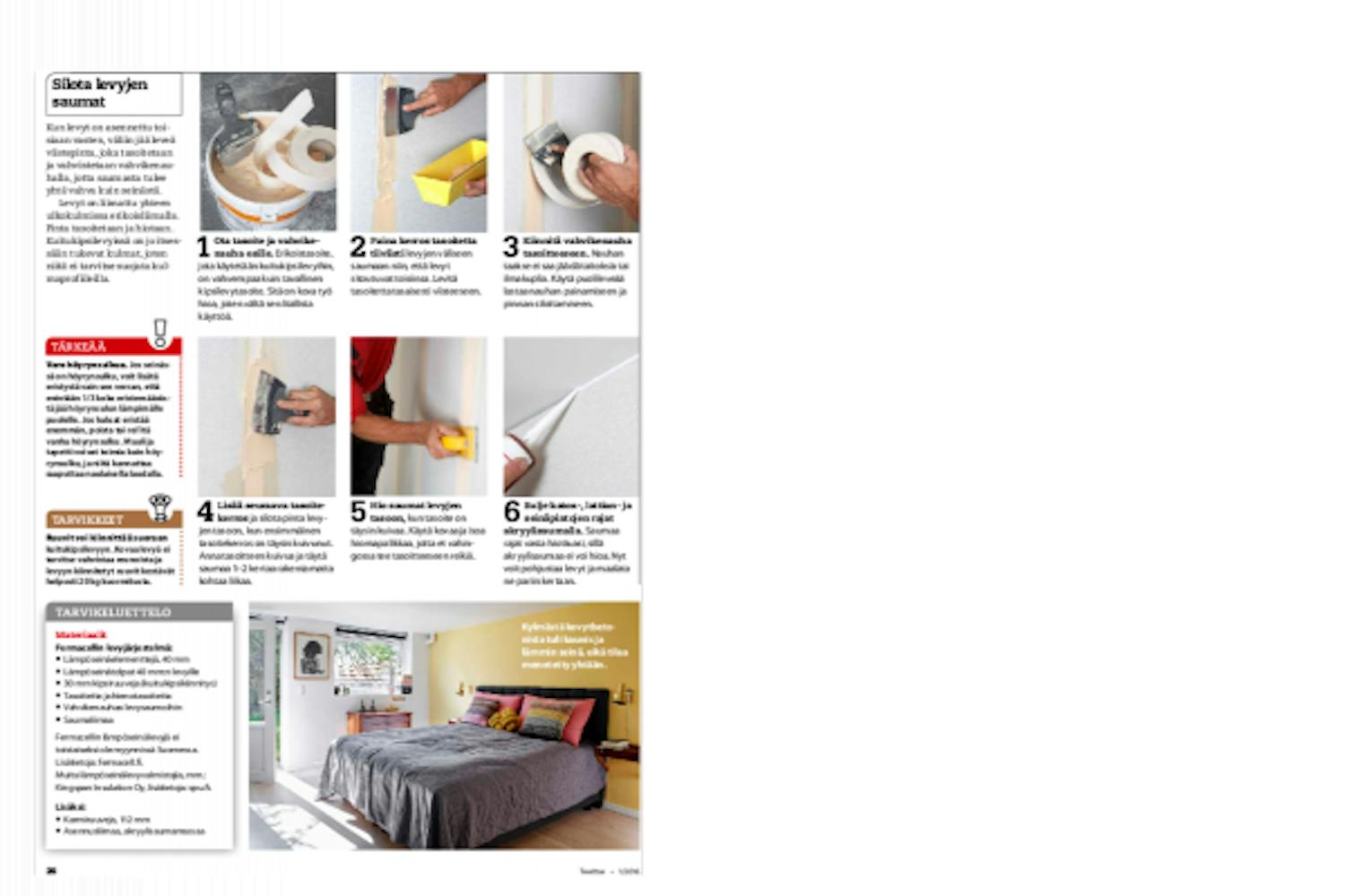 Paina kerros tasoitetta tiiviisti levyjen väliseen saumaan niin, että levyt sitoutuvat toisiinsa. Levitä tasoitetta tasaisesti viisteeseen.