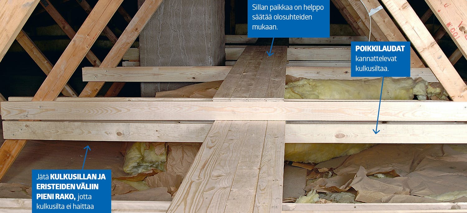Kulkusilta helpottaa välikatolla liikkumista ja työskentelyä.