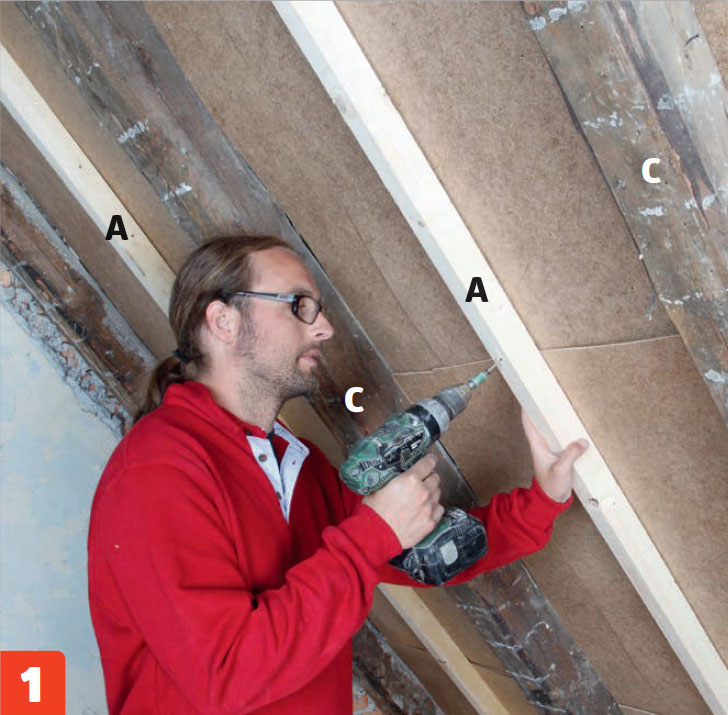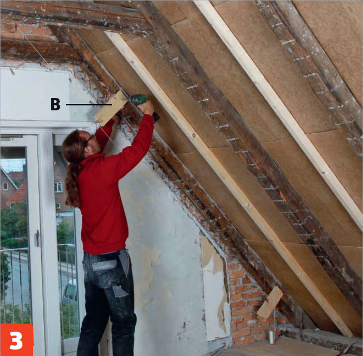 Kattopalkkien (C) alle asennetaan koolausrimat (A). 5 senttiä paksut rimat pitävät eristeet irti aluskatteesta. Siten eristeiden päälle jää tuuletusrako ja kosteus pääsee haihtumaan ilmaan.