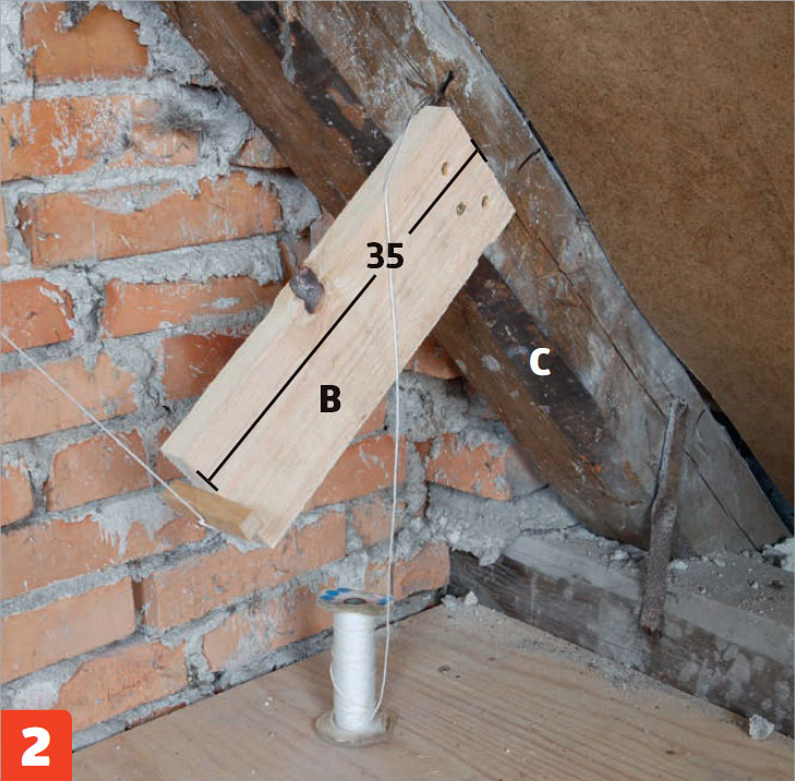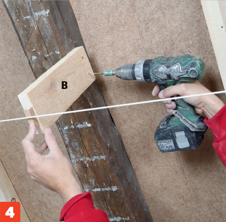 Ruuvaa laudanpätkät (B) myös palkkien yläpäähän ja keskelle. Pidä linjalangat irti palkeista välikapuloiden avulla.
