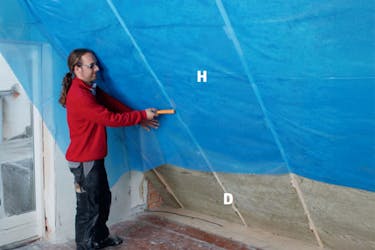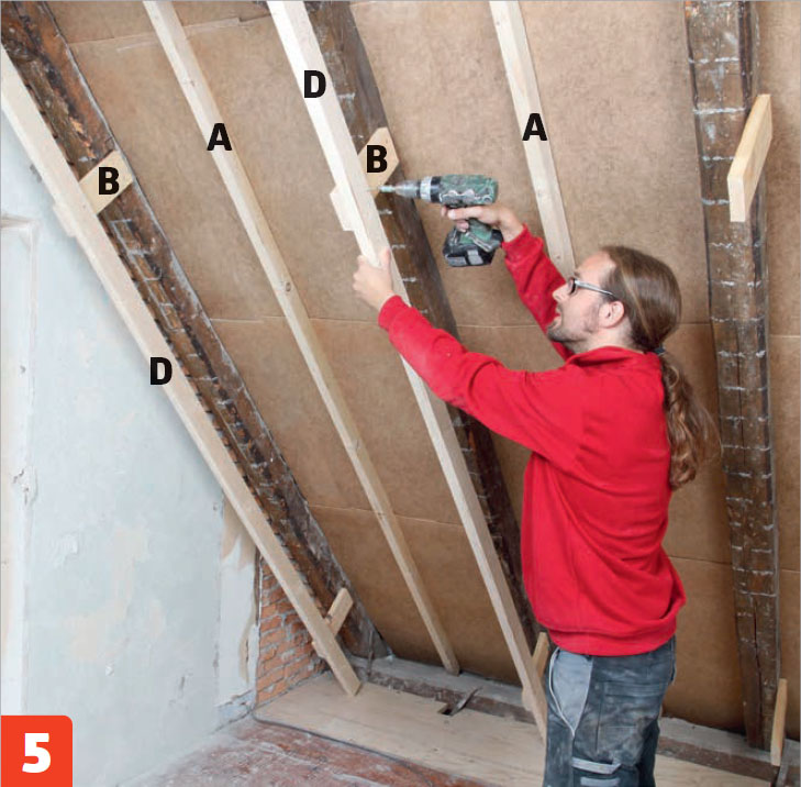 Kiinnitä koolausrimat (D) laudanpätkiin. Laudanpätkät (B) on säädetty oikealle tasolle linjalankojen avulla. Lopuksi koolausrimat (D) jäykistetään asentamalla lisää laudanpätkiä vähintään metrin välein.