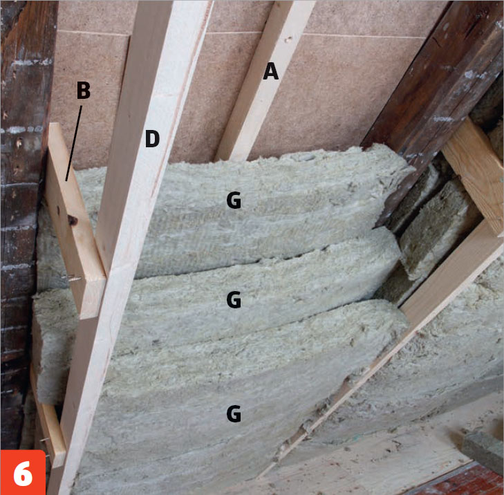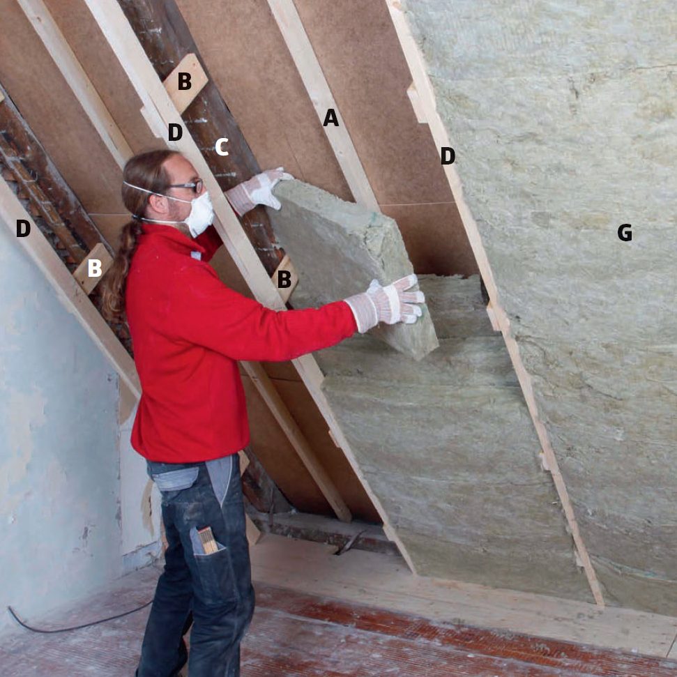 Sen jälkeen voit eristää palkinvälit mineraalivillalla (G). Tässä asennetaan limittäin kolme kerrosta 95 millin villalevyjä, jotta lämpö ei karkaa eristeiden välistä. Leikkaa levyt tarkasti.