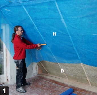 Kiinnitä höyrynsulkumuovi (H) koolausrimoihin (D) hakasilla. Aloita ylhäältä ja jatka alemmas. Limitä muovikaistaleita vähintään 10 senttiä.