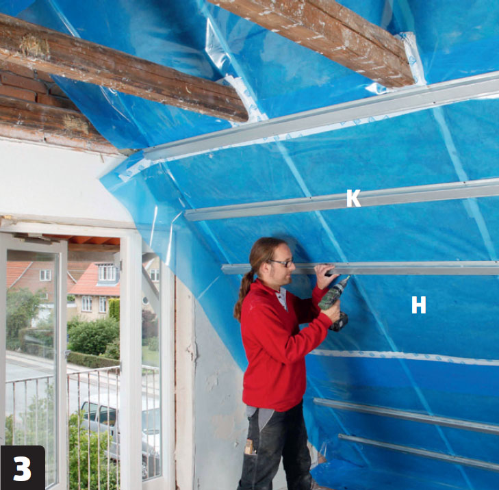 Kiinnitä asennuskiskot (K) höyrynsulkumuovin (H) päälle. Ensimmäinen kisko tulee aivan kattopalkkien alapuolelle. Loput kiskot kiinnitetään 45 sentin välein.