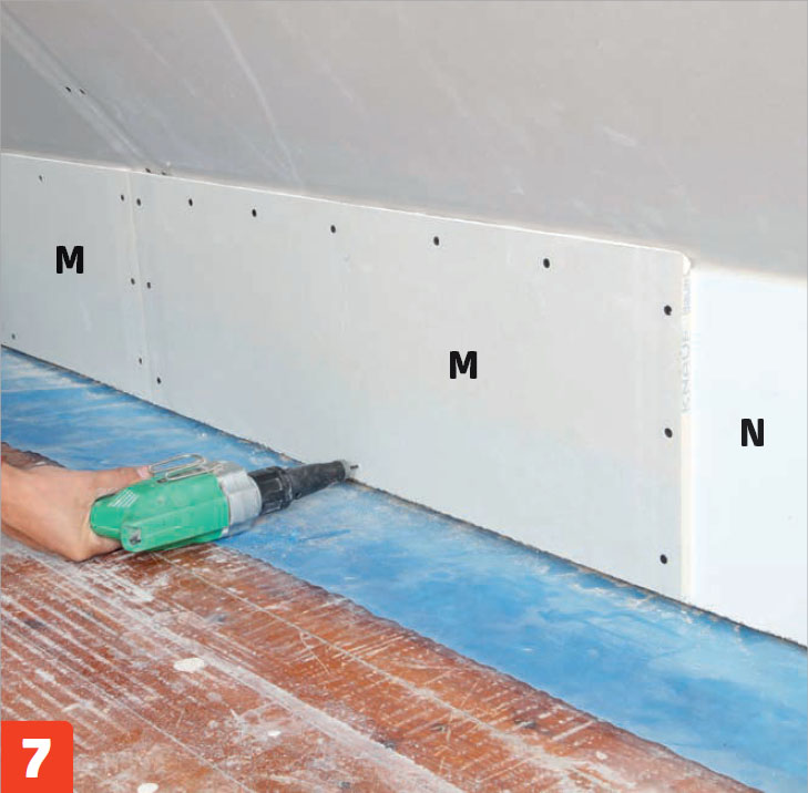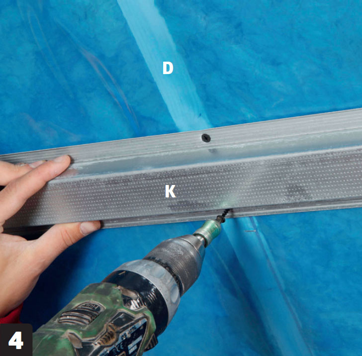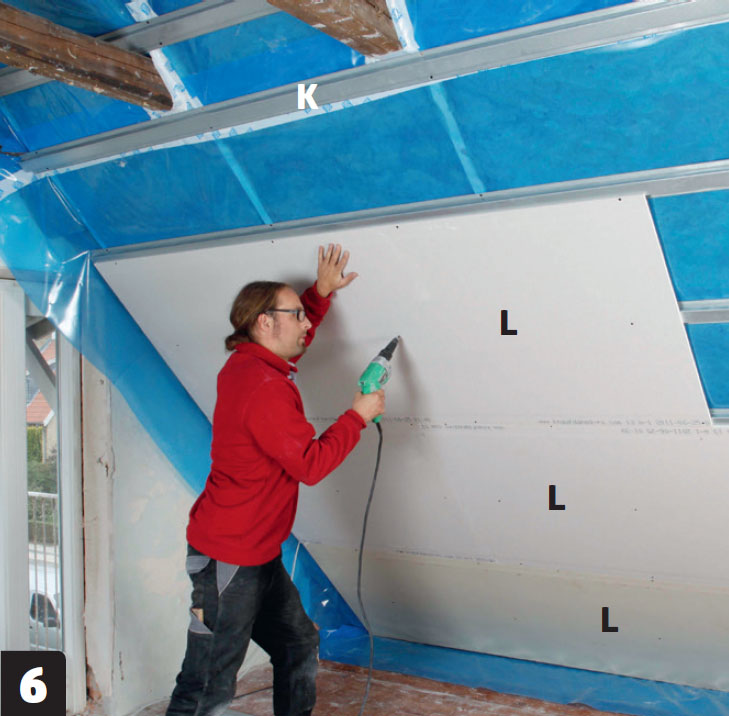 Ruuvaa kipsilevyt (L) kiinni 25 millin ruuveilla, jotka eivät mene höyrynsulun läpi. Aloita alhaalta, jotta voit nostaa loput levyt niiden varaan. Halkaise alin levy siten, että se sopii teräsrankojen (K) jakoon.