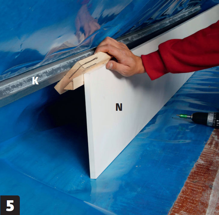 Asenna katon alareunaan ylimääräinen kisko (K), jos haluat tehdä reunaan matalan seinän. Tässä rangan paikka selvitetään 30 senttiä korkean levyn (N) avulla.