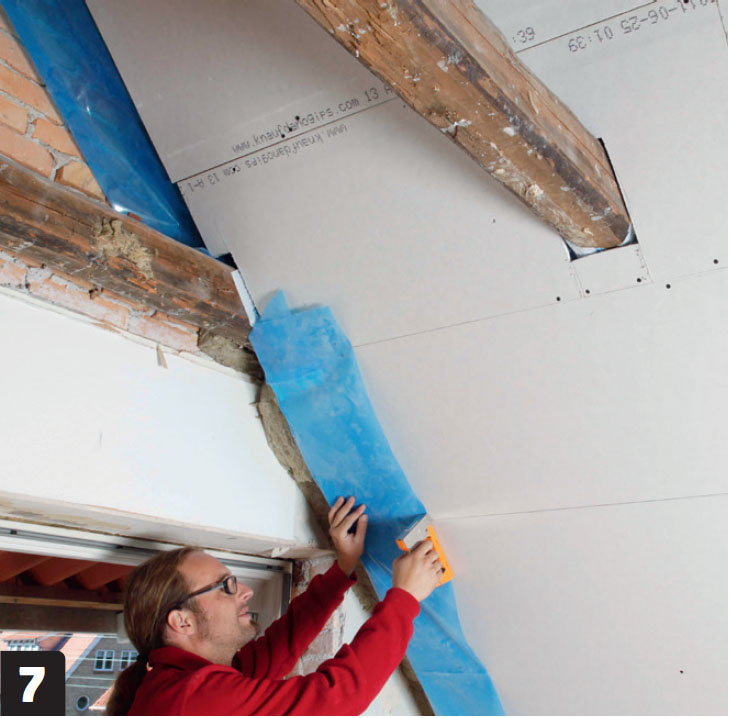 Nyt on aika asentaa toisen kerroksen kipsilevyt vinoon kattoon. Niitä limitetään puolen levyn verran alempiin levyihin verrattuna siten, että saumat eivät osu päällekkäin.